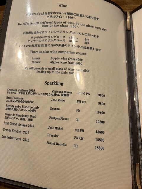 いつもワインペアリングをお願いしています。こちらのワインでハズレたことがないです。苦手な赤も飲みやすい。デザート以外の各メニューについて、ディナーだと6000円。