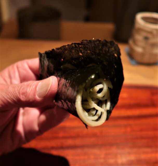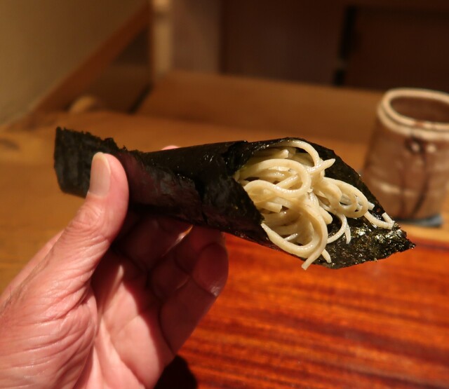直前に炙ったパリパリの海苔に巻かれた大将が拘りぬいた蕎麦は、