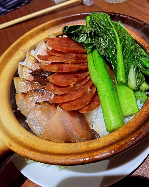 そして〆のご飯は焼豚?と腸詰と上海の菜葉(名前は失念)の土鍋ご飯、特製のタレに絡めてお焦げも香ばしく本当に美味い