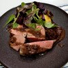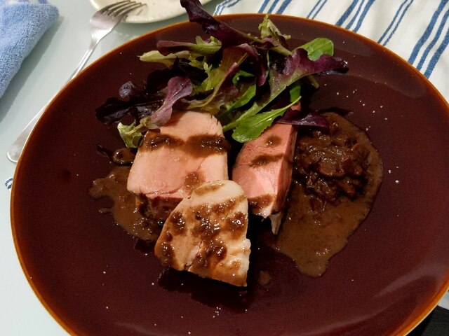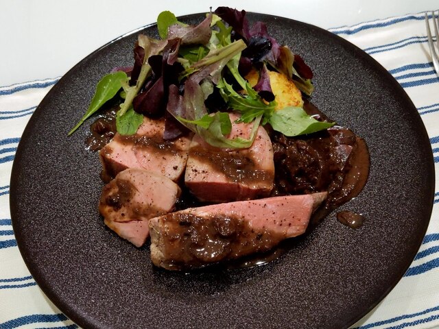 ソースは砂糖と一緒に飴色に炒めた玉葱とにんにくに赤ワインを加えて煮詰めて、