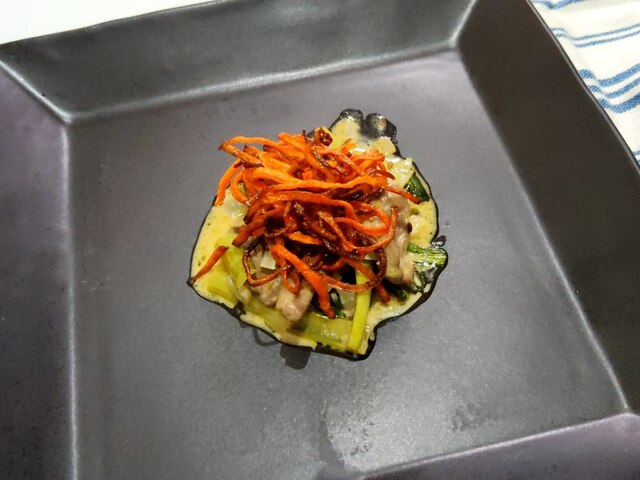 千切りにした人参をクミンシードと一緒にオリーブ油でカリカリになるまで炒めて、