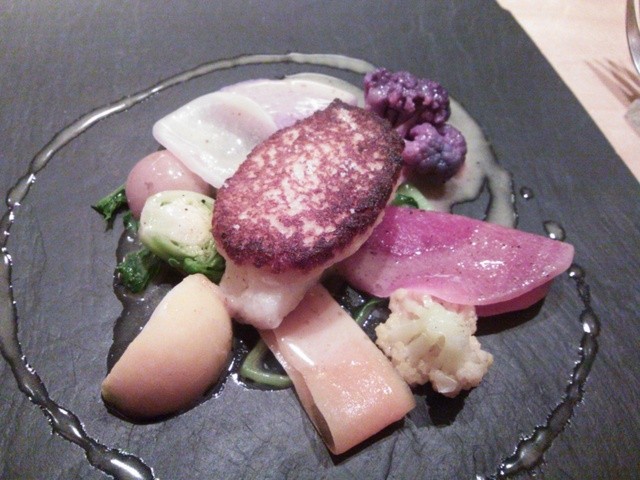 青ハタのポワレ 味噌を塗って里芋のピュレをサラマンドルで 青ハタのフュメのバニラ風味レモンビネガーソース