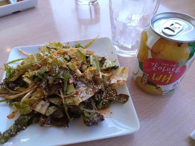 注文はもちろんサムギョプサルセット、ネギサラダと梨ジュース
