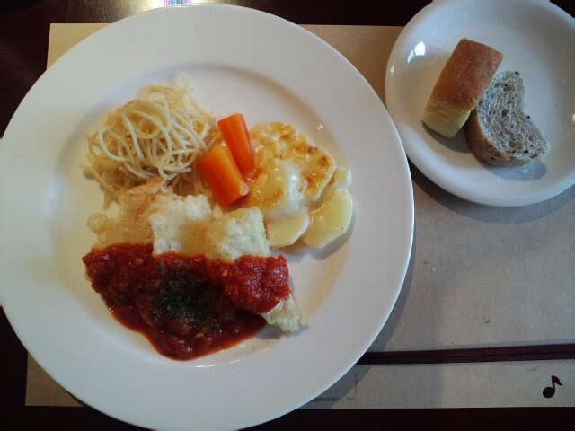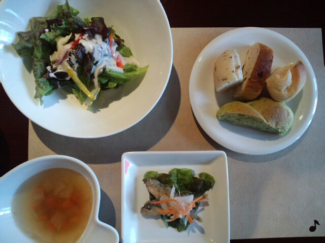 芸濃町でイチゴ狩りをする前に、ちょっと軽めのランチをということで開店(11時)と同時に入店しました。場所が分かりにくいのですが、二度目だし、道路に看板が立てられていて迷わずに行くことが出来ました。貸切状態かと思っていたら、次々とお客さんが入って来て、早めに来て良かったのかも知れません。土曜日ということで、ホリデーランチ(1500円)を注文しました。連れはパスタを自分が本日の一品を注文しました。料理はヘルシーで軽めなので、女性のお客さんが多いようです。この日も予約がたくさん入っているようでした。焼きたてのパンが食べ放題なのですが、前回お邪魔したときは、小さめのパンが数種類丸ごと出されていたのですが、今回は細かく切り分けられていました。時間を見て違う種類のパンが出されるので、時間をかけて食べるといいかも知れません。料理の量から考えて、少々高めの値段かと思いますが、食後の飲み物とデザートも付いて、雰囲気も良く、近くに行ったときにはまた立ち寄ってみたいと思います。