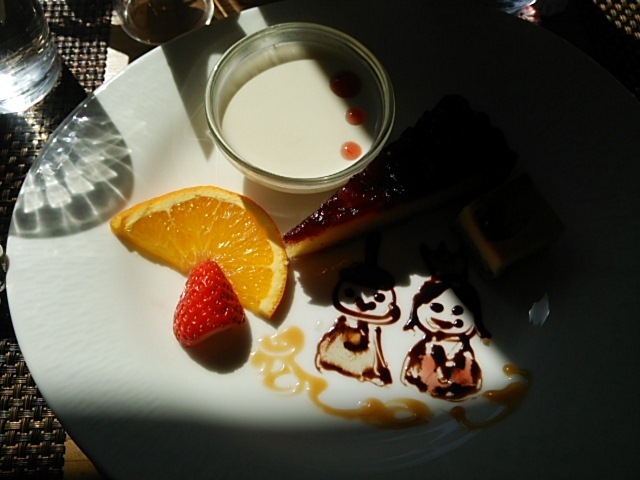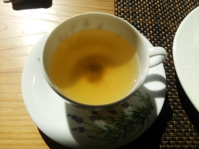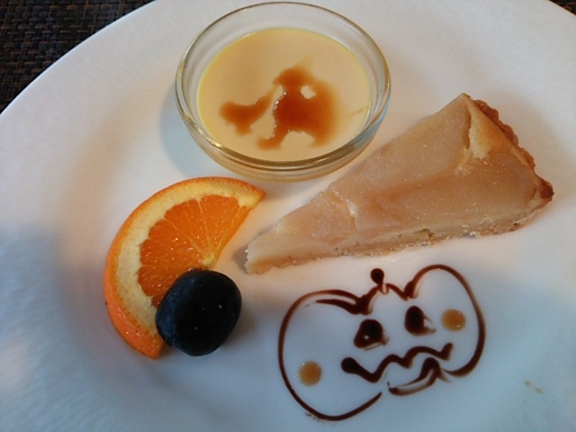 飲み物は、もちろんハーブティーの「おやじブレンド」(メタボ対策のダイエット茶)を、デザートはカボチャのプリンと洋梨のタルトです。