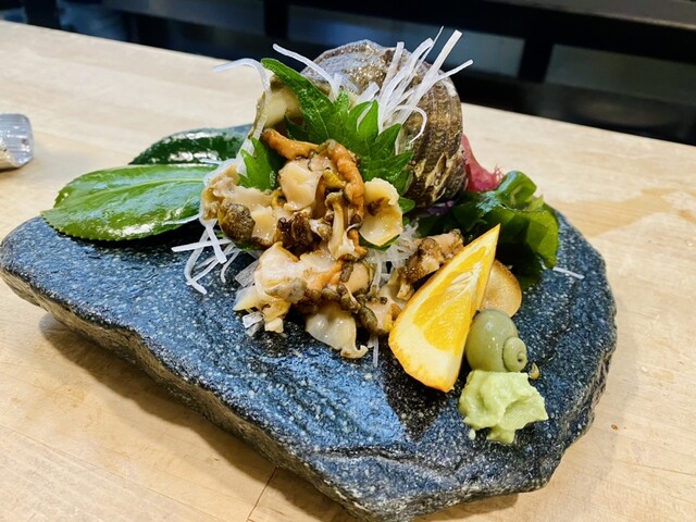 定番のタコブツも良いですが、車海老!塩焼きにて。ふと気付いたワインあるじゃない!魚介ではやはり素晴らしいハーモニー。白ワインと和魚介、当然のように合います。最後は、これもお初のサザエのご飯(正式名称忘れました)で〆ました。