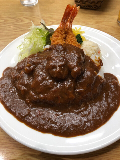お一人様で初訪しました。店内は広々とした昭和の喫茶店の風情です。まずは瓶ビールで喉を潤してからの海老フライカレーを注文しました。一皿に盛られたサラダも上手に収まって食べ応え満点です。辛さのレベルはハバネロパウダーでセルフ増しでした。