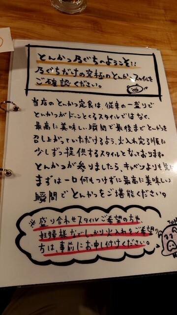メニューを渡していただき、人気No.1は乃ぐちのとんかつ定食と書かれているけど、最後にかつ丼付きのおまかせ定食もお勧めとのことで、乃ぐちのおまかせ定食 2種(3300円)をお願いします。