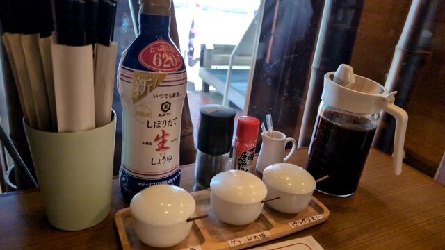 テーブル机の上には、お塩が4種類、ソース、一味、醤油が置かれています。