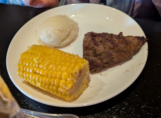 子供メニューのメイン(Grilled Steak にMashed PotatoesとButtered Corn-on-the-Cobを選択)