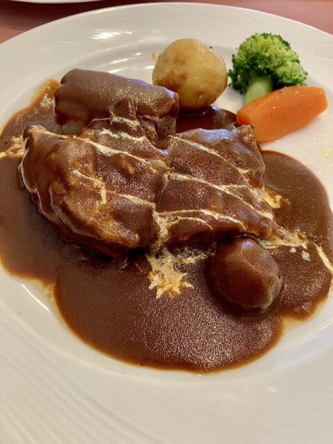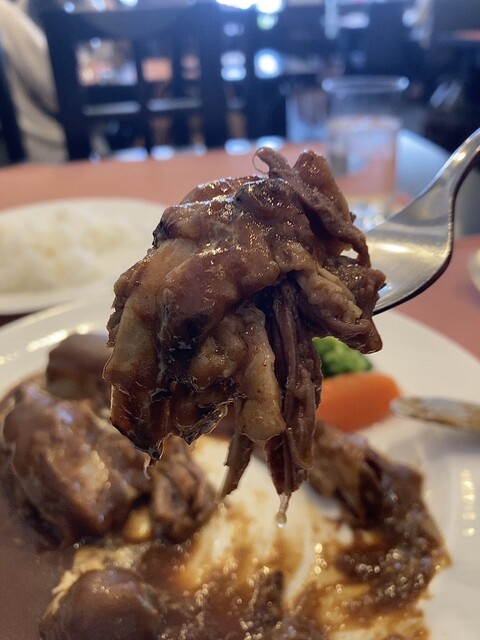 ナイフで切って食べてみると、脂肪の周辺はトロトロですが、肉の部分は柔らかいながら歯応えがしっかりしていて、牛肉の旨みがとても濃厚です。ただ、デミグラスソースは意外にサラリとした味と食感。旨み、コク、塩味、酸味、など尖った部分が全く無く、まろやかでバランスの取れた上品な味わいです。