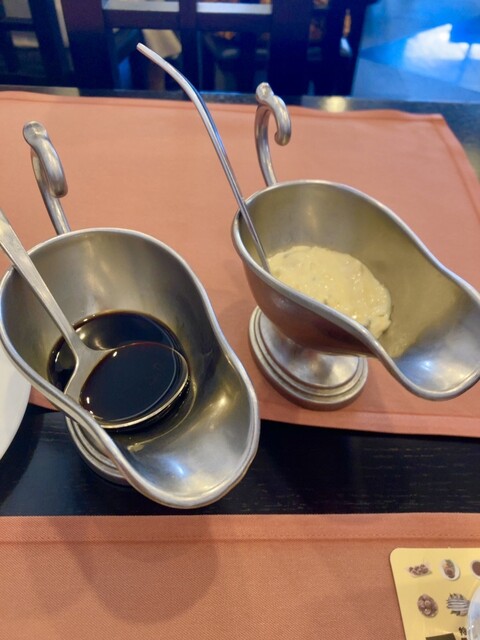 途中でビールのアテに注文した「小エビのフライ(小)」が到着。(小)は、通常メニューのハーフサイズ。カレーポットが2つ用意されて、ウスターソースとタルタルソースがたっぷりと入っています。さすが、何とも丁寧です。