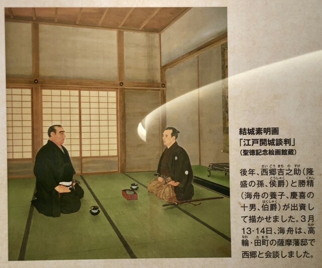 慶応4年(1868)の3月13日から翌日にかけて、勝海舟と西郷隆盛の会談が行われ、「江戸無血開城」を実現させた。「江戸開城談判」の画。