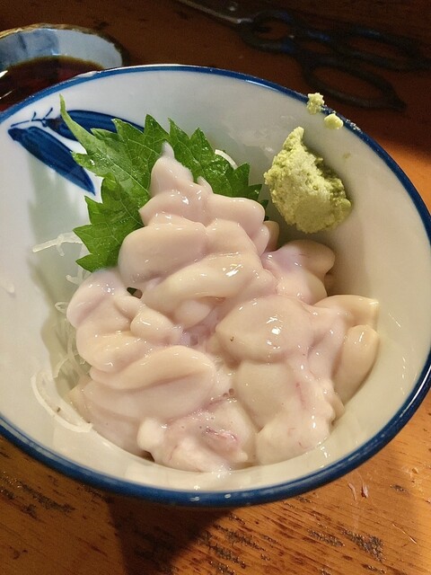 そろそろ旬を迎える真鱈の白子。昨年も食べましたが、同僚のリクエストで注文。最近何度か飲み屋で白子の天ぷらを頂いていますが、生の白子は食感がよりプリッとしていて、しかもとろける様な舌触りは天ぷらとまったく同じ。ワサビ醤油で頂きましたが、旨味もしっかり楽しめ、こちらもお酒のアテにぴったりです。