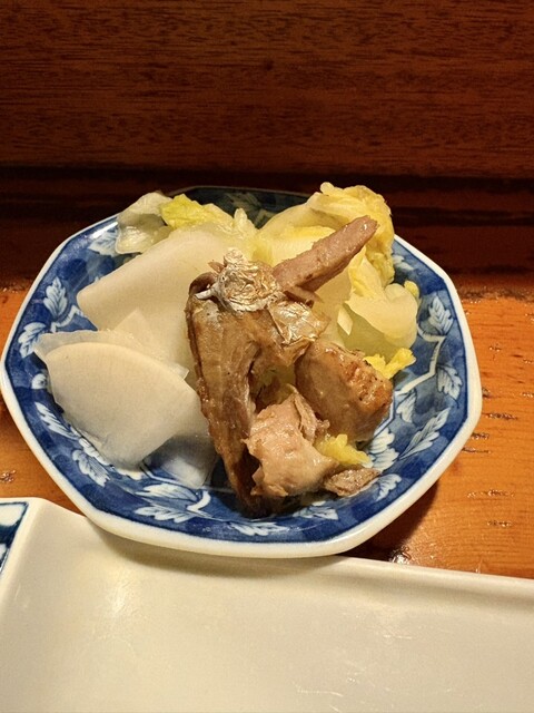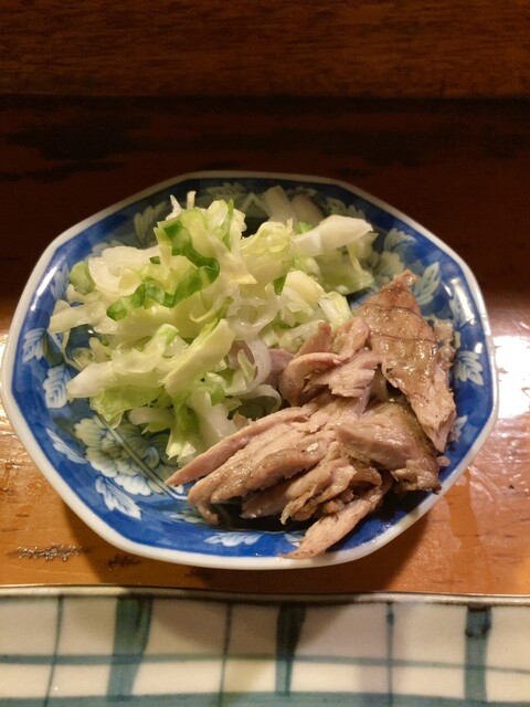 ビールとほぼ同時に提供されたお通しは、キャベツとカブの漬物、それに鰹のハラスの煮物が付いたもの。鰹のハラスは、脂がたっぷりのっていて、冷めても旨味が濃厚です。シンプルですが美味いお通しです。