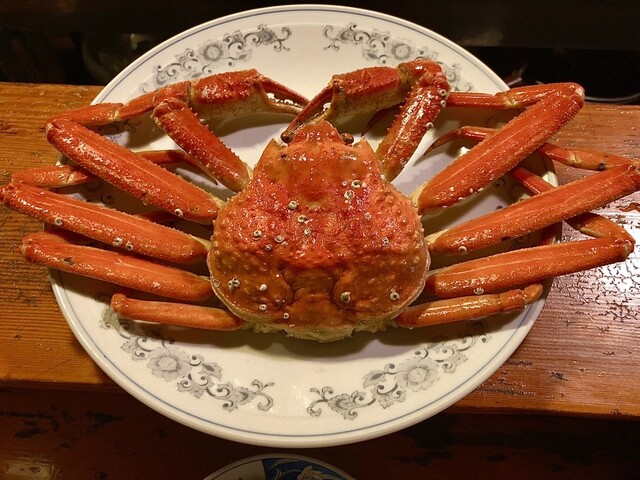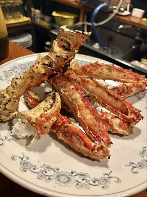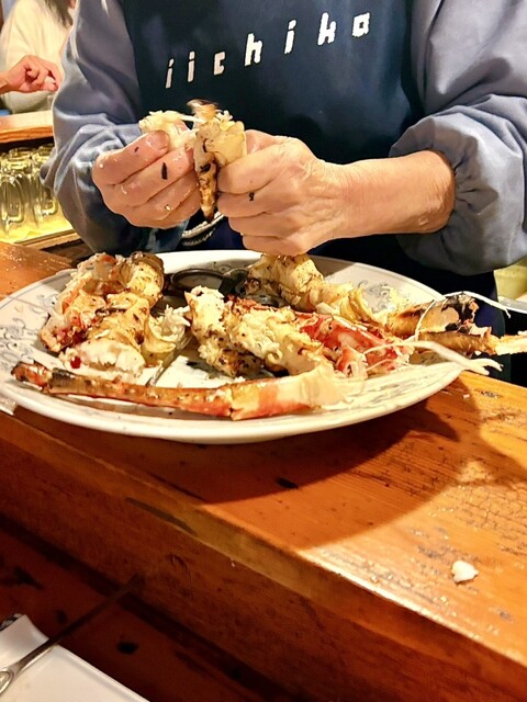 この日は、ズワイ蟹とタラバ蟹があり、ズワイは7000~8000円/杯。中サイズの大きさで、3人で食べるには少々小さいように感じたので、思い切ってタラバ蟹(特大)をお願いしました。驚くほど極太のタラバをガスコンロでじっくり焼いて提供してくれました。焼きタラバが出来上がると、直ぐに殻剥き名人のおばあちゃんが手際よく向いてくれ、3人の口の中に順番に食べさせてれます。何もつけずシンプルに、口いっぱいにほおばる極太の焼きタラバ、甘いタラバ蟹の美味さが口いっぱいに広がります。ああ、なんと贅沢なひと時!めっちゃ幸せを感じます♪