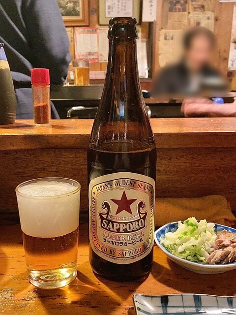 私は赤星で、同僚は生ビール。今回もいいお店で美味しく飲める幸せに乾杯!男は黙ってサッポロビール(by 三船敏郎)、ん〜美味いっ!ちなみにお通しは、キャベツの漬物と鯵か何かの干物をほぐしたもの。渋いね。