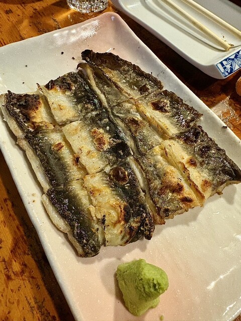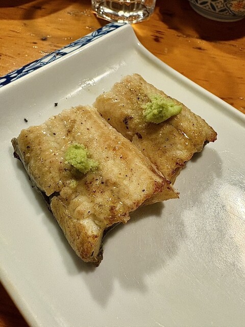 これまた贅沢に鰻の白焼きです!正直言って白焼きは食べた事がなく、一度白焼きでお酒を飲んでみたいと思っていました。白焼きもたらば同様、網で焼いただけのシンプル料理。焼き上がった白焼きは、ワサビをのせてそのまま頂きます。焼いた皮面はパリッとした食感で、身の方はふっくらと芳ばしく焼き上がっています。脂はのっていますが、蒲焼の甘いタレが掛かっていないので、白身魚の様な淡白な味わい。なるほど、白焼きは日本酒と一緒に頂くと、最高ですね。