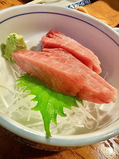 そろそろ戻りガツオも終わりの時季。終盤の戻りガツオを頂きましょう。大きくて分厚いカツオの刺身が6切れもあって、見るからに美味しそう。適度に脂ののったカツオは、ねっとりとした歯応えで旨味がとても濃厚。正直ここまで美味いカツオは中々ありません。めっちゃ美味いです!生姜とニンニク両方を使って頂きましたが、日本酒との相性は最高でした。