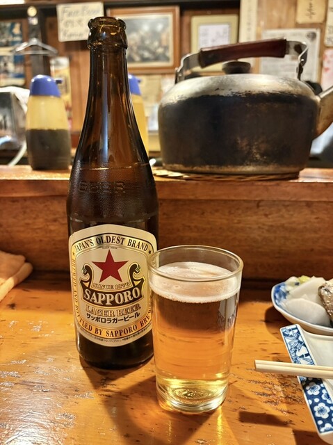 名前を告げると、コの字カウンターの奥の方に案内され、坐ります。相変わらず天井からぶら下がった裸電球、年季が入った木製のコの字カウンター、お酒を直に入れて飲む黒ずんだヤカン、お客さん同士の距離感がほぼ屋台のような狭い店内、すべてが変わらず昭和初期の雰囲気で時が止まっているようです。あ~~、めっちゃ落ち着く(笑)。