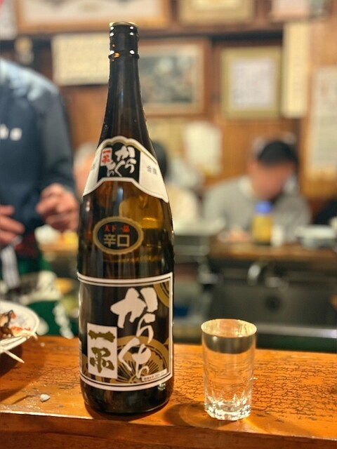 「かにや」さんで熱燗を頼むと、一升瓶からお酒を黒ずんだヤカンにドボドボ注いで、ガスコンロで温めた後にコップに注いでくれます。コップには表面張力でギリギリまで注いでくれ、最初は口を近づけてズズッと飲むのが「かにや」の流儀。男も女もワイルドです。ちなみに同僚は5杯くらい飲んでました(笑)。なお、「一品」は寛政二年(1790年)創業の水戸の蔵元。水戸ではお馴染みのお酒です。