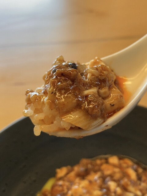 麻婆豆腐の下にはご飯がありますが、ご飯が熱々なのと麻婆の辛さとで、めっちゃ汗を掻いてしまいました。