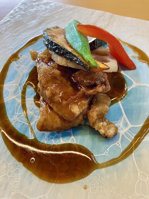 オクラ、カボチャ、茄子、パプリカ、蓮根、豚肉の唐揚げが入った黒酢酢豚。野菜のひとつひとつの旨味を十分に引き出してくれる酢豚だと思います。
