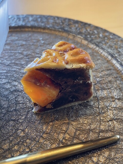 月餅の中には、卵黄の塩漬けが入っていて、単に甘いだけの月餅ではなく、甘塩っぱい味わいです。普段月餅は滅多に食べる事がないので、珍しく美味しく頂きました。