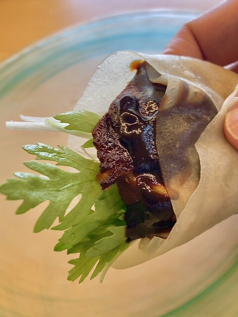 今まで一度も食べたことの無い北京ダックが1枚から注文出来るので、追加してみました。甜麺醤(テンメンジャン)と言う中国の甘味噌のような味付けで、コクの深い味です。北京ダックを包む皮は、「薄餅(パオビン)」というものらしいのですが、名前の通りもちもち食感でした。もう一つ食べたかった(笑)。