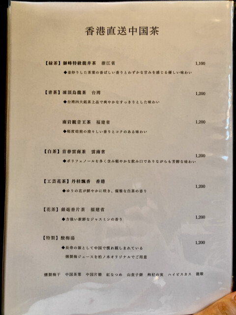 我儘を聴いて頂き誠に申し訳なく、ありがたく思います。中国茶は、メニュー3の写真から選びます。私は「銀豪香片茶(ジャスミンティー) 」をお願いしました。