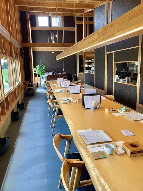 平日ですが、開店時間に合わせて11時に予約して伺いました。店内は八溝山の杉を多用したお洒落でウッディな造り。そして何より目を惹くのは、中央にある8mもの大きなテーブル。