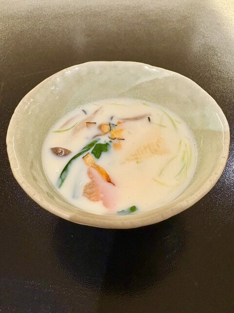 湯葉と野菜の豆乳蒸しです。温かい野菜や鶏の団子も入っていて、美味しい豆乳スープといった感じ。余計な味が付いていないので、やはりシンプルで優しい美味しさ。