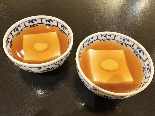 名物の「あんかけ豆富」×2椀。鰹出汁のあたたかいあんかけを豆富の上にたっぷりかけ、からしをのせた一品
