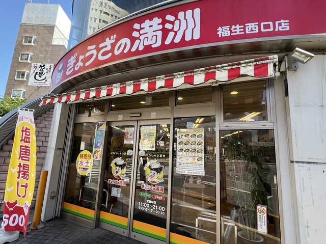 野暮用で福生に用がありお昼を何処かで頂こうと駅周辺を散策しましたが、西口には飲食店があまり無く駅反対側へ行くのも億劫で嫌気がさしていたところ、目に入ったのがぎょうざの満州さんでした。一見、お惣菜屋さんかスーパーかと思いましたが 何と中華屋さんでした。「まあいいか!」と思い着席をしてメニューを拝見して驚きに驚きました。「異次元のCP値!!」焼き餃子が ¥300円。餃子ライスが ¥500円。チャーハンが ¥550円。タンメン・味噌ラーメンが各々 ¥610円。