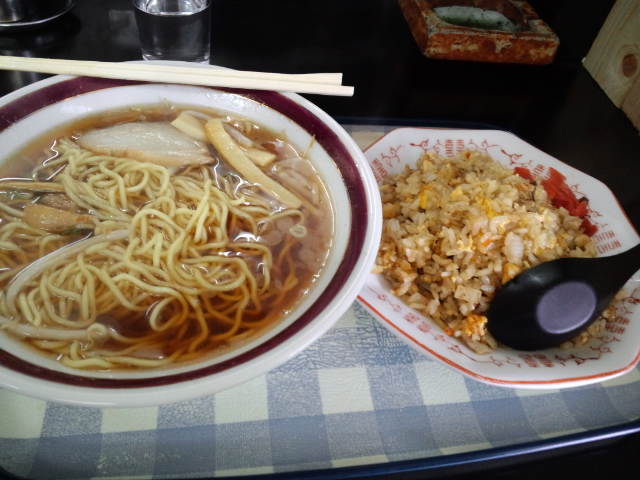 5分ほどでラーメンと半チャーハンが先着・・・・ラーメンの色がないw・・・スープの味が薄い。