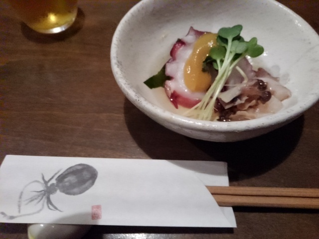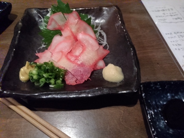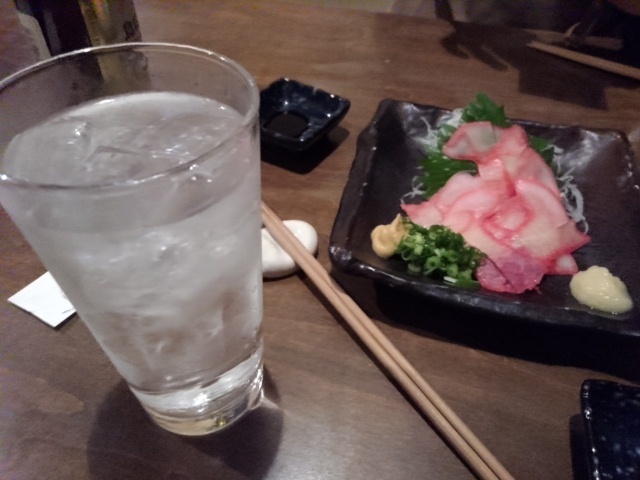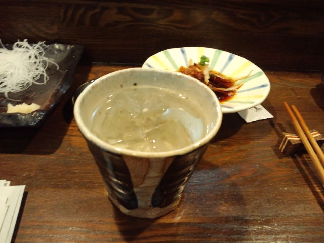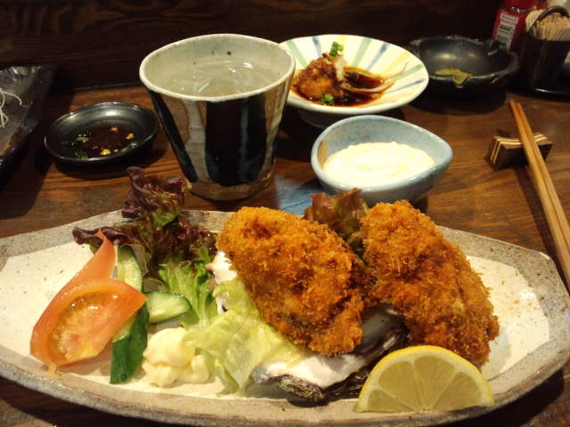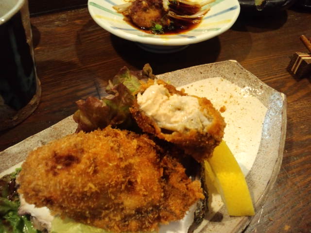 今日も8時集合の飲み会,呑んベの私は我慢出来ずにさっさと米子に。評判の良い「エンジン」を覗いてみようと6時少し過ぎに行ったところ、なんと早くも「満席」の札が。階段の上がり端に置いてあるのは親切だな〜んて感心して、じゃあ何処行こうかとかんがえてたら思い出しました、朝日町の「蛸十」から入った所に懐かしい「幾の」があったのを。高島屋の裏手にあった時にはよく行ったものですが、高島屋にテナントで入ってから行かずに居た所閉店されていました。6時15分入店先客は奥の小上がりに3人。小上がりは4人用*2。カウンターは6人くらいかな。カウンターに座ってまずビール。突出しはつくね、コリコリとした食感がおいしい。昔よく食べた「クジラのベーコン」(ニンニクと酢みそがついてましたが、塩の方が好きです)を発見、今時珍しいですねっと、注文。角ハイボールも注文(4:1ではなく2:1の割合で入れてくれて濃い!旨い!)。べーコン旨い!クジラの脂の旨味がタマラン。岩牡蠣は生も有りましたが,あえてフライを注文。かなり肉厚な牡蠣、ミルクがジュワー!最高!思わず一人で「旨い!」ご主人と奥さんにっこり!「でしょ」。8月末まで食べれるそうです。最後に焼酎ロックを(お酒の種類多数)飲んでごちそうさまでした。又来ます。