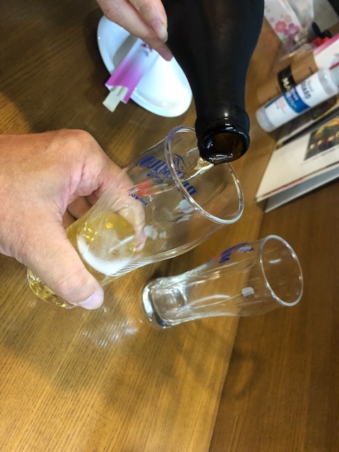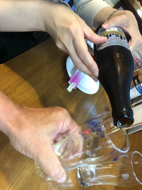 まずは瓶ビールで「コロナに負けずに頑張ろうね」と乾杯。