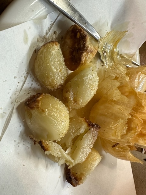 唐鍋2人前(初級を注文。辛さ3段階の一番下ですが結構スパイしー)・親鳥焼き・ニンニク丸揚げ(写真・・・奥さんがバラしてくれます)・ズリ焼き(奥さんが今日のお薦めと勧めてくれました)を注文。