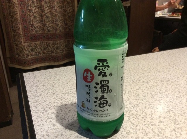 生マッコリ(酒屋には置いてないらしい)のボトルを注文・・・醗酵シュワシュワが危険なので奥さんが開けてくれます。