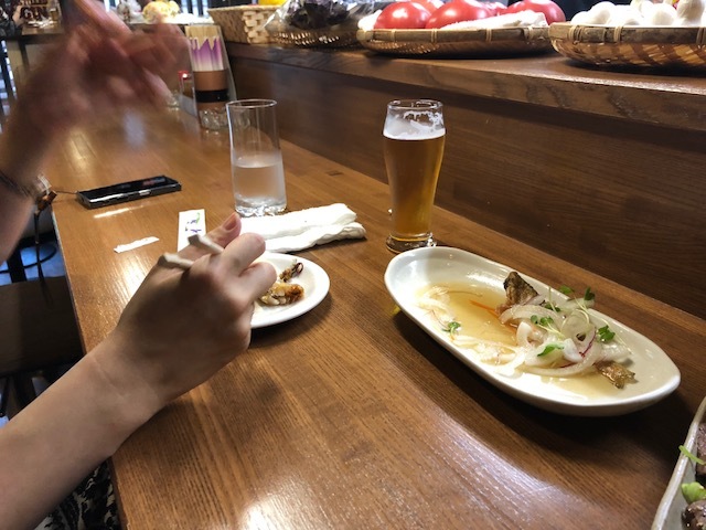 向かい合わせに座ってまずは「ちっちゃな」ビールでこんちわ!今日はアリ(´・ω・)(´_ _)ガト♪と乾杯。