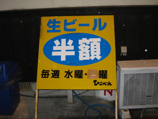 18時45分頃到着。入口横に「水曜日生ビール半額」の看板。今日は水曜日「これは嬉しいですね」と言いながら入店。