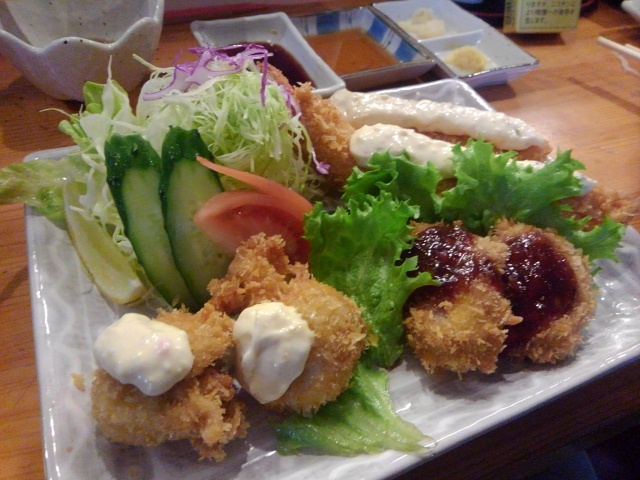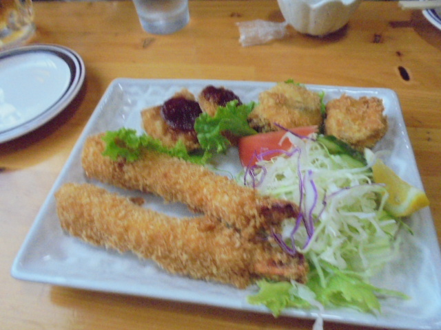 全部旨かったです、汁をごはんにかけて食べたかったな〜、なんぼでも焼酎飲めます。「フライ(ホタテ・カキ・エビ)セット」揚げたてサクサクジュワ〜・・・焼酎グビグビ!「串やき盛りあわせ」塩で仕上げてありましたが肉の旨味ギュッ!つくねはそれ自体も旨味がギュっと詰まった美味しさでしたがタレもいい具合のお味・・・まだまだ飲めるぞ〜。