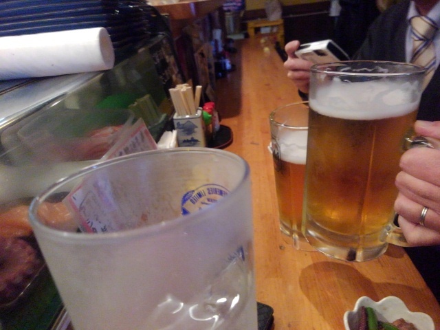 予約してあったと思われる座敷に3人で「ヨッこらせ」とおすわりと同時に「ビール!ちょーだい」常連さんの後光のせいか「すぐでる生ビール(半額!)」どんなに慌てても写真は3人で撮りながら(まだ酔ってない)今日の3人と、逢わせてくれた「食べログ」に乾杯!!!琴浦のビールは旨い!