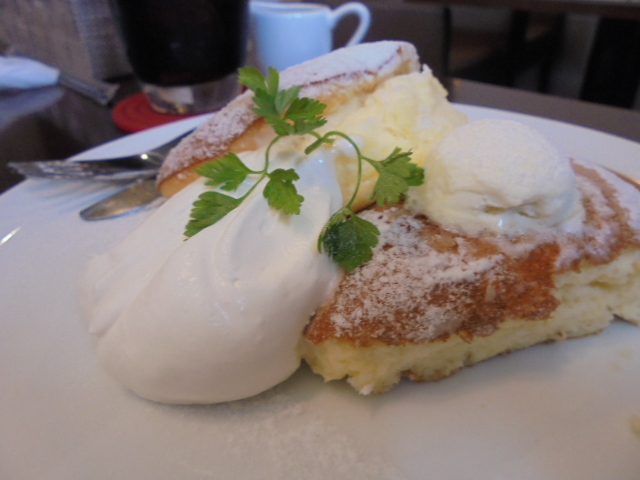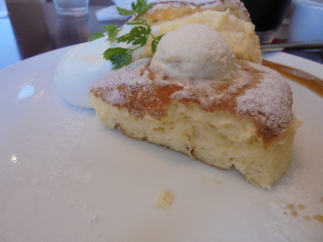 まずはパンケーキだけをパクリ・・・お〜〜ふわふわでなんとも云えん食感、甘くておいし。