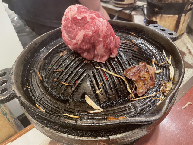 網焼きの味付けラムがデフォルトで出され、店員さんが焼いてくれる。