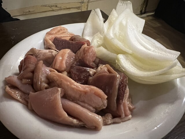 ホルモンは色んな部位が混ざっているミックスホルモン、玉ねぎ付き。アツアツっ、ウマウマっ!