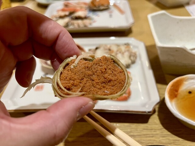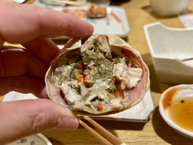 旬の香箱ガニ、カニ味噌も内子•外子も、たっぷり!!海鮮茶碗蒸しも具たくさん!数量限定なので開店と同時に行かないと食べれません。
