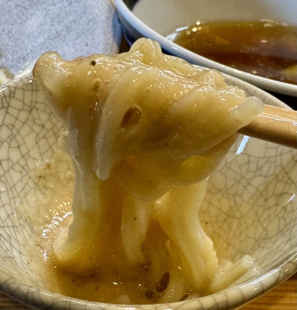 麺は、ひもかわうどんばりに幅広なものと、美しく折りたたまれた中細ストレートの2種類で、多加水らしいしなやかさと鮮やかな小麦の風味を両立させた、真空ミキサー仕立てのような洗練された食感が印象的。