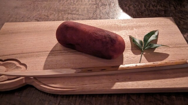 ナツメグに北海道の発酵バターとくるみを挟んで、のせて。柿の葉が素敵