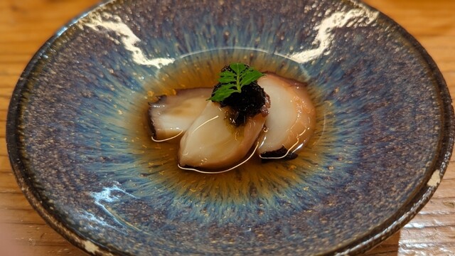 3週間熟成させて、低温調理された蛸。海苔の佃煮と木の芽が凄く合う